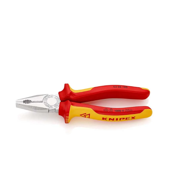 Knipex 1000 v Kombine Pense 180 mm Bu knipex elektirikçi pensesi, ağır hizmet kullanımına uygun olan kombine pense çeşitlerindendir.1000 V ortamlarda kullanım için uygundur. Yüksek kaliteli malzemelerden üretilmiştir.Ağır çalışmalar için yaklaşık 60 HRC sert kesicilere sahiptir.Krom kafa yapısı ve sarı kırmızı çift bileşimli sapları sos izole olup, sağlam ve dayanıklı bir üründür.Ergonomik tasarımı sayesinde sağlam kavrama ve rahat tutuş imkanı sunar.Yuvarlak ve yassı malzeme kavrama bölgeleri ile çok amaçlı kullanım sağlanabilir.Uygulama alanı bakımından 3.4 mm yumuşak ve 2.2 mm orta sert tellerde kullanım sağlanır.Kesici uçları ile temiz kesim imkanı sunar.Kaliteli ve dayanıklı yapısı ile uzun ömürlü kullanım sağlanabilir.Ürün Özellikleri Sap: SOS İzole, Sarı-Kırmızı, Çift Bileşenli Kafa: Krom Kesme Değerleri:Orta Sert Tel: 3.4 mm Sert Tel: 2.2 mmÇok Telli: 12.0 mm - 16 mm 2 Uzunluk:180 mm Ağırlık:265 gr